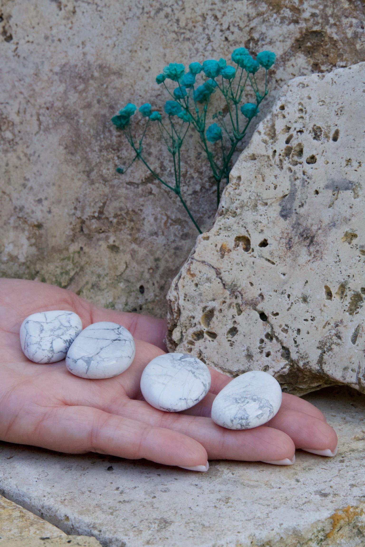 Cada rodado plano de Howlita es natural y único. Puede presentar variaciones en vetas y tonalidades blancas o grisáceas que reflejan su origen mineral.