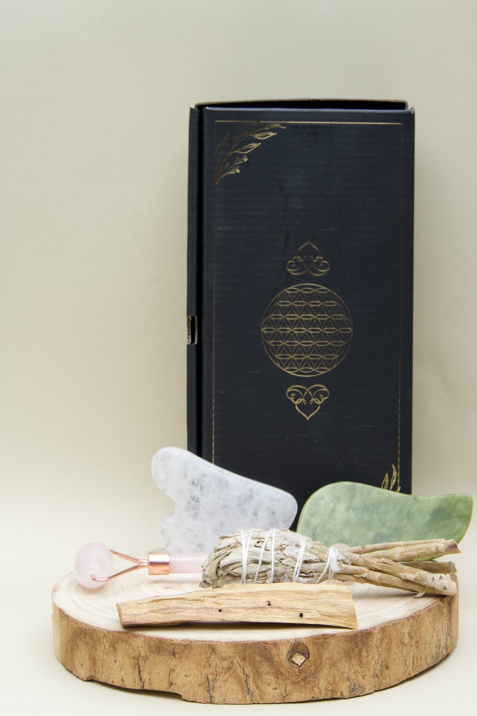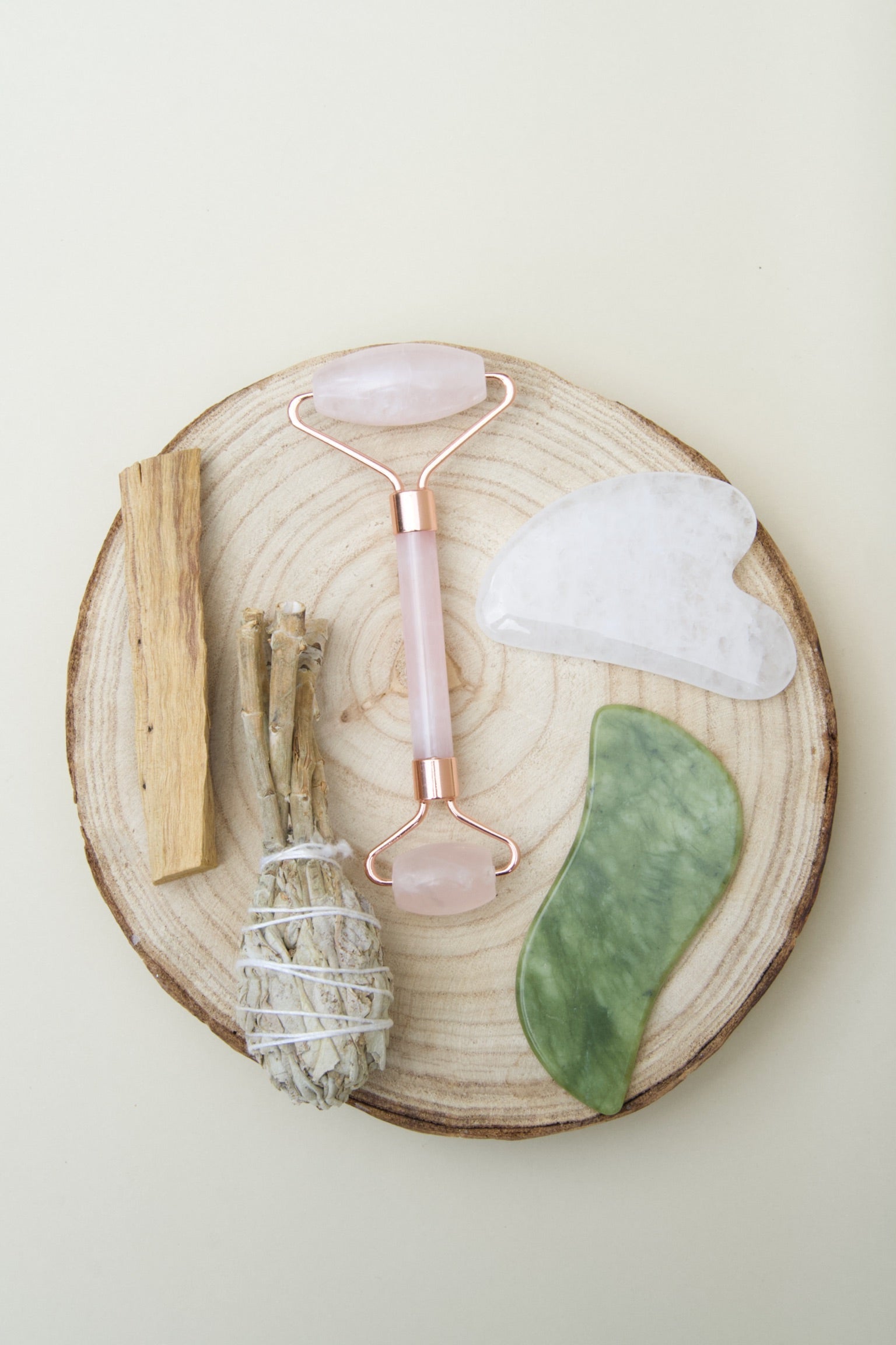 • Contiene: 1 Gua Sha de cuarzo blanco, 1 masajeador facial de cuarzo rosa con doble rodillo, 1 masajeador de jade, 1 antorcha de salvia blanca de California y 1 palo santo